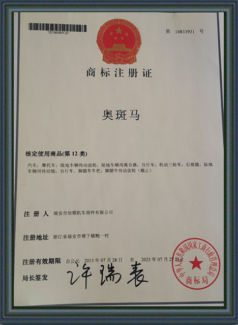 恒顺机车部件商标证书